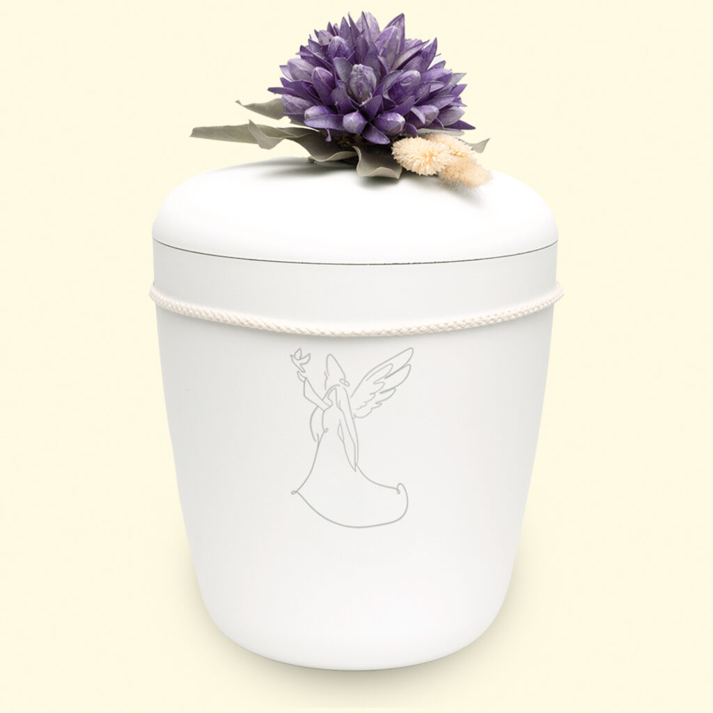 The lid of our urn features a carefully chosen fabric cord, to which a floral arrangement of your choice can be attached. This detail allows for the creation of a personalized and meaningful memorial that reflects the personality of the deceased. The delicate beauty of the flowers provides comfort and honors the unique life, leaving a final farewell in a natural and dignified manner